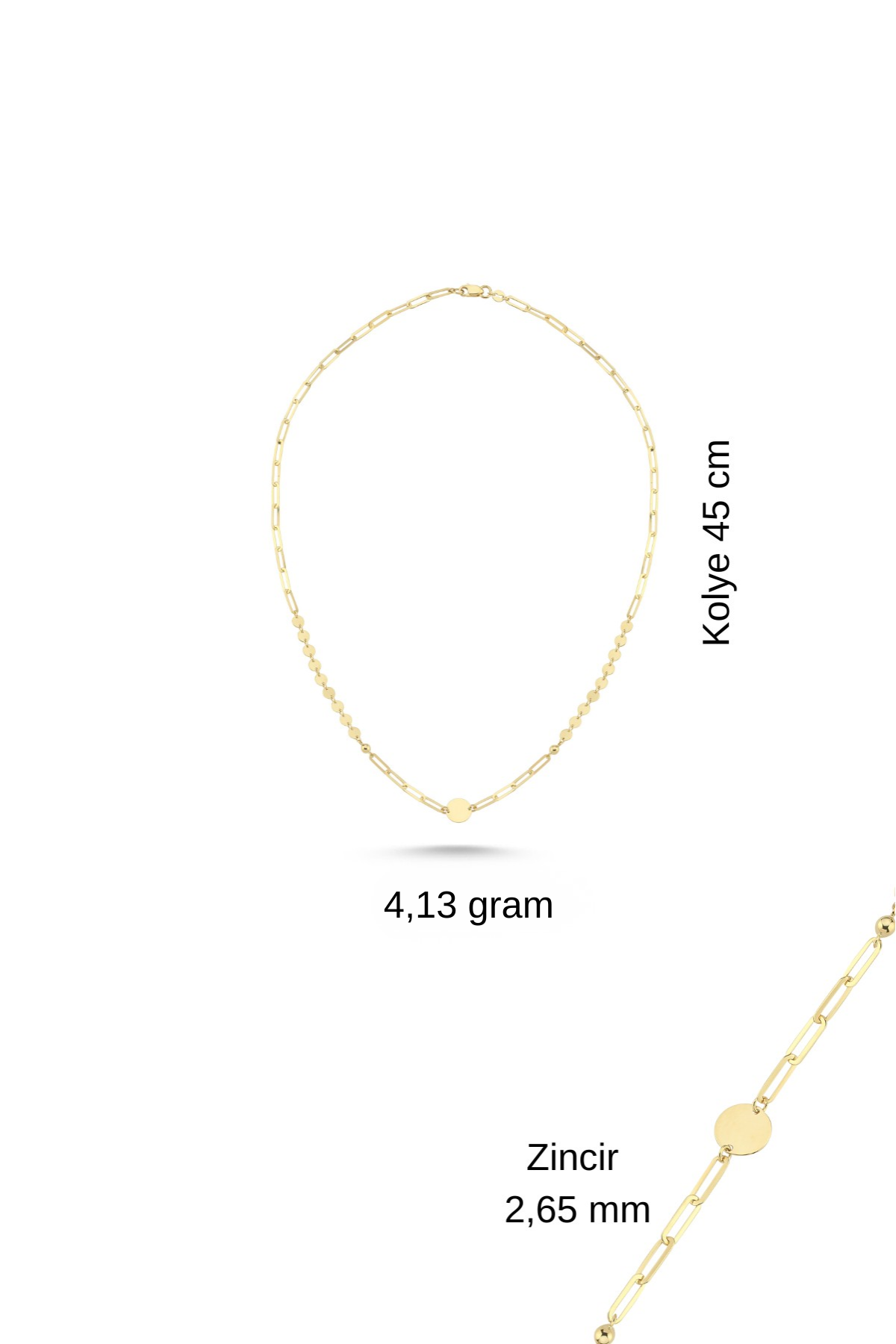 - Kolye uzunluğu 45 cm. Ataçlı zincirli genişliği 2,65 mm.